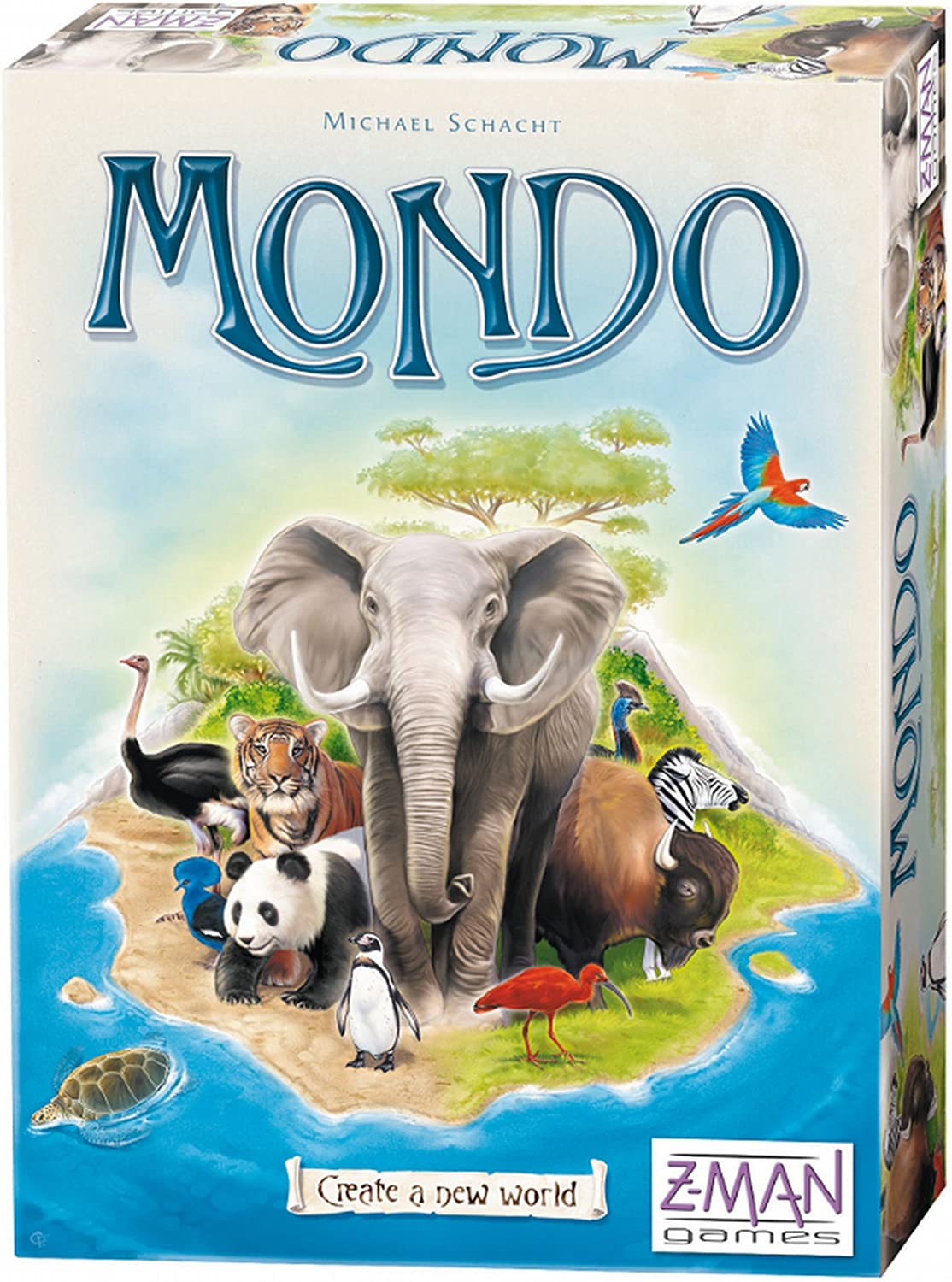 In Mondo, players compete against each other while also racing against the clock. Each player has a small world board with empty spaces on it, and all players simultaneously pick tiles depicting different animals and environments from the middle of the table and place them on their world board, trying to create complete areas of the same environment. A new tile must be placed next to an already placed tile, but the environmental borders don't have to match. (These errors will earn negative points when the board is scored.)
